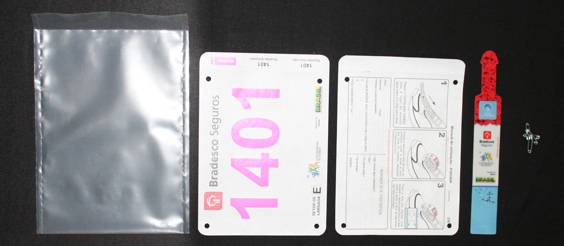 Número de peito, chip e alfinetes entregues ao organizador em envelope plástico transparente, com identificação do atleta,